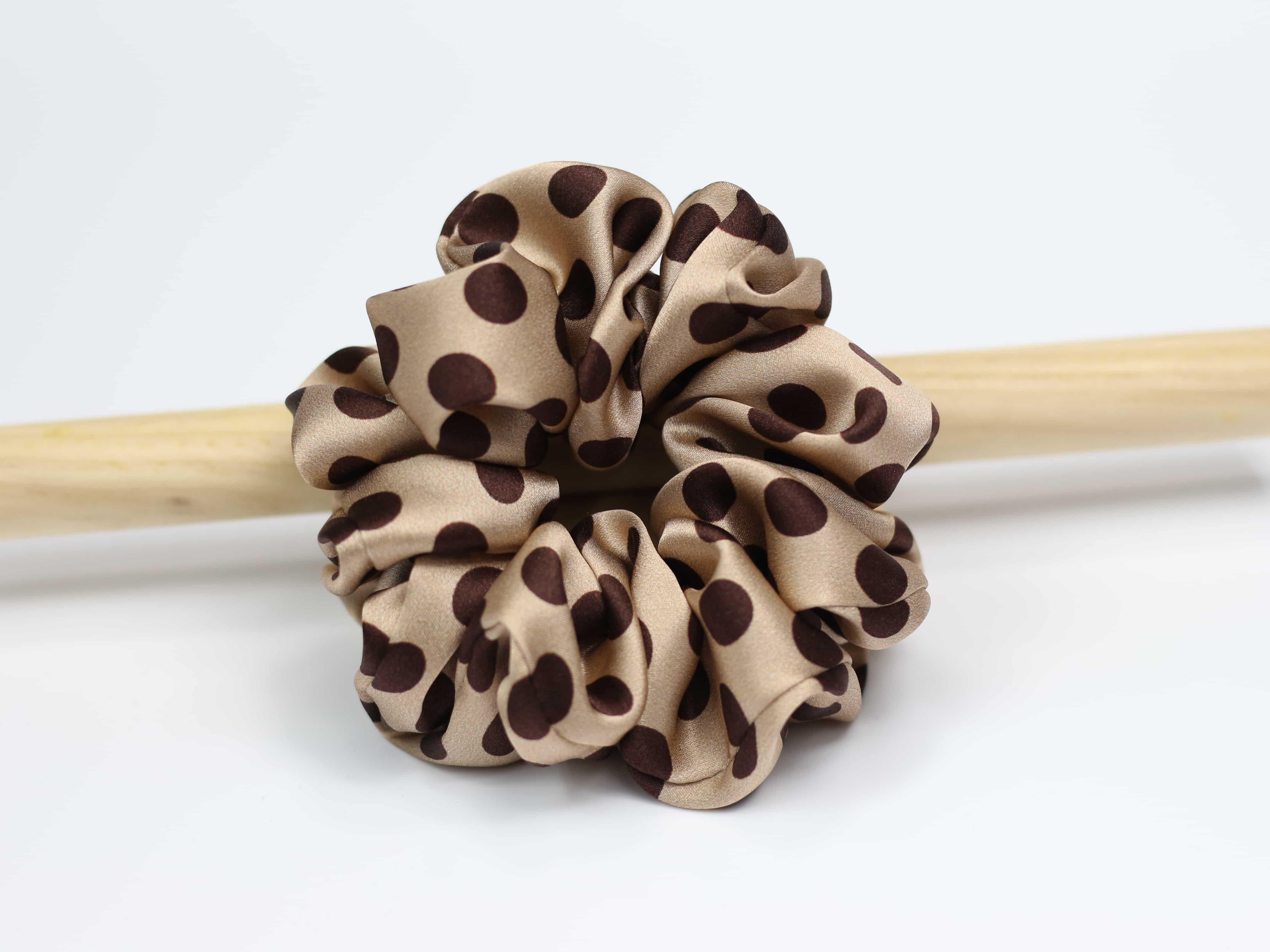 5. Jedwabna scrunchie MEDIUM - latte w czekoladowe groszki