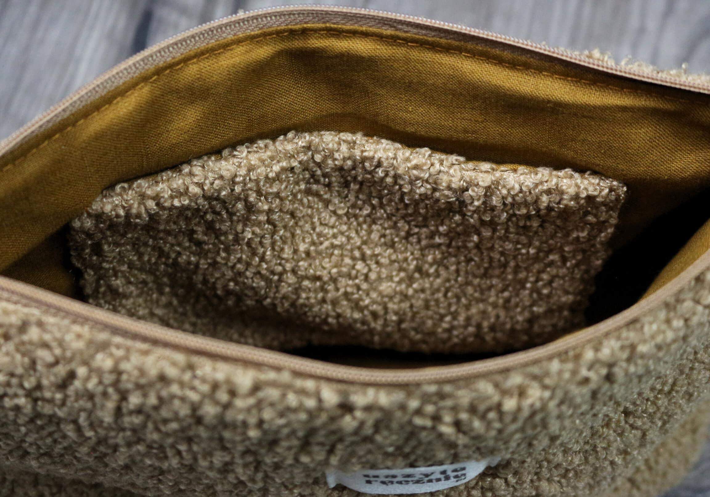 Kosmetyczka wykonana ze sztucznego misia oraz lnianej podszewki. W środku posiada dodatkową kieszonkę.