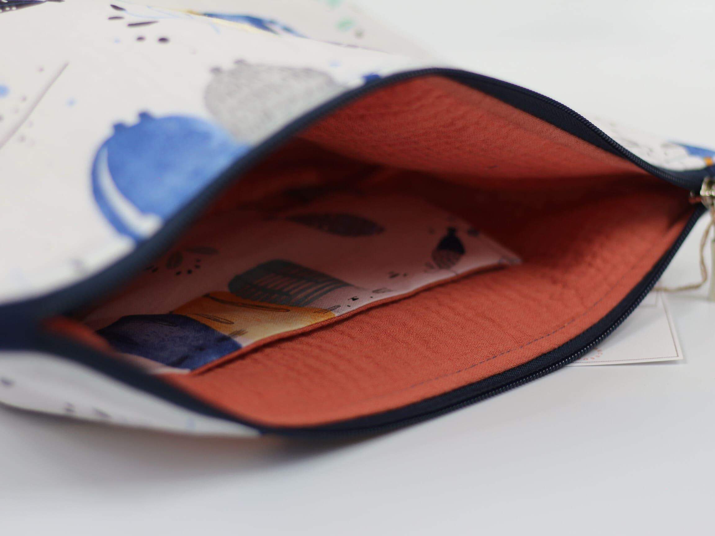 Kosmetyczka wykonana z bawełnianej tkaniny wierzchniej oraz muślinowej podszewki. W środku posiada dodatkową kieszonkę.