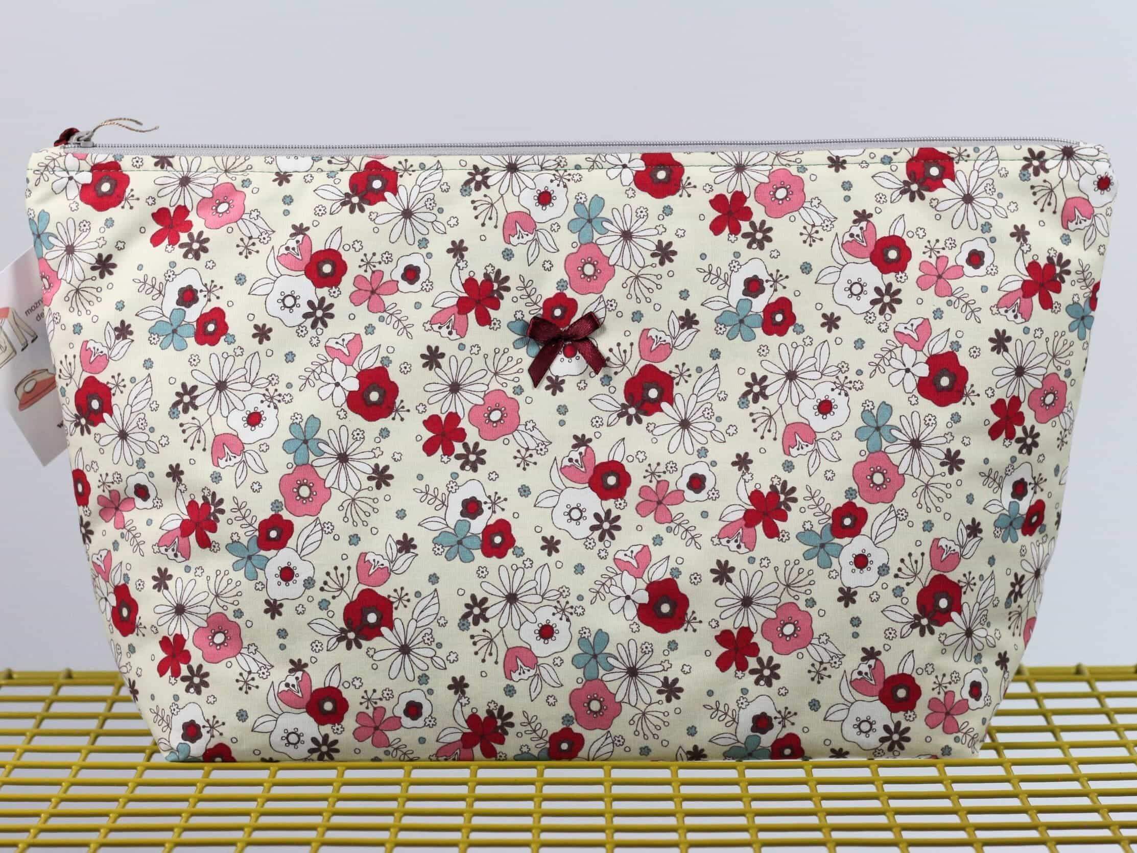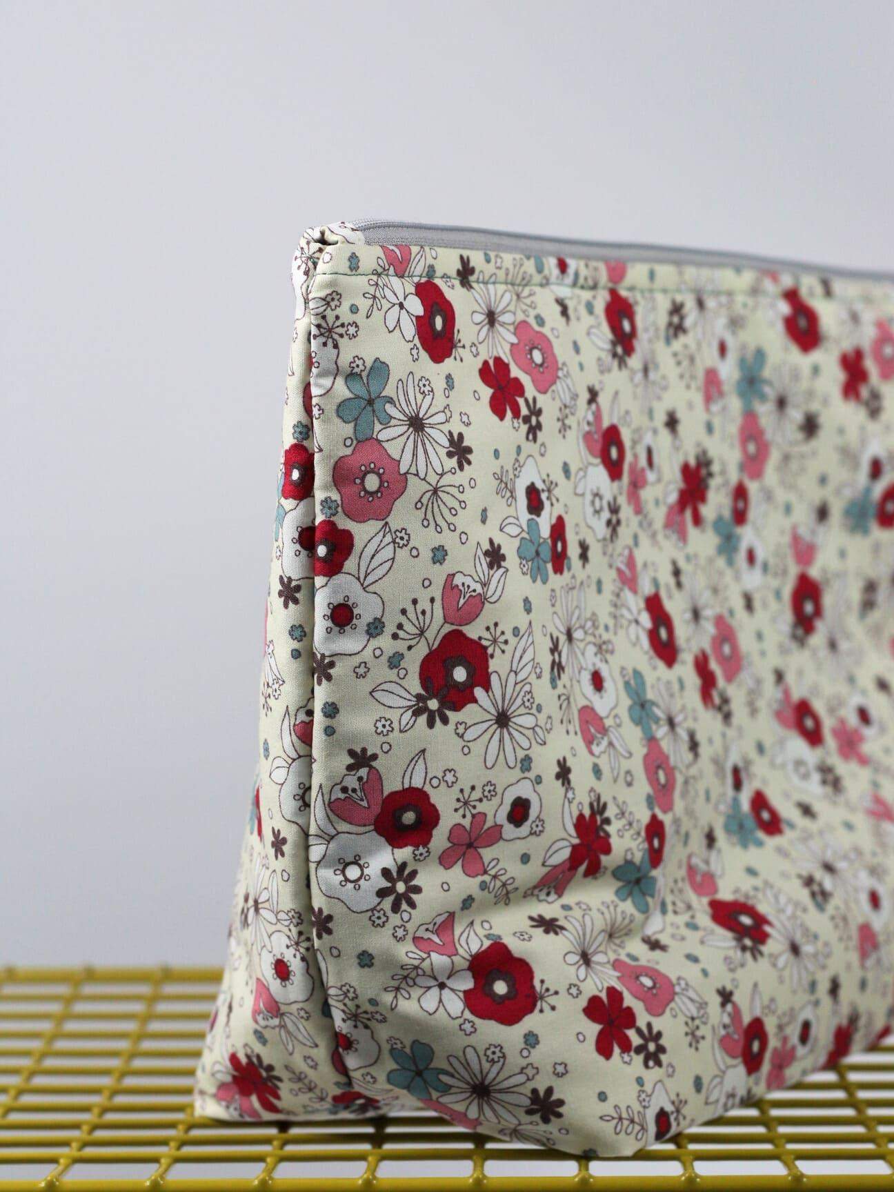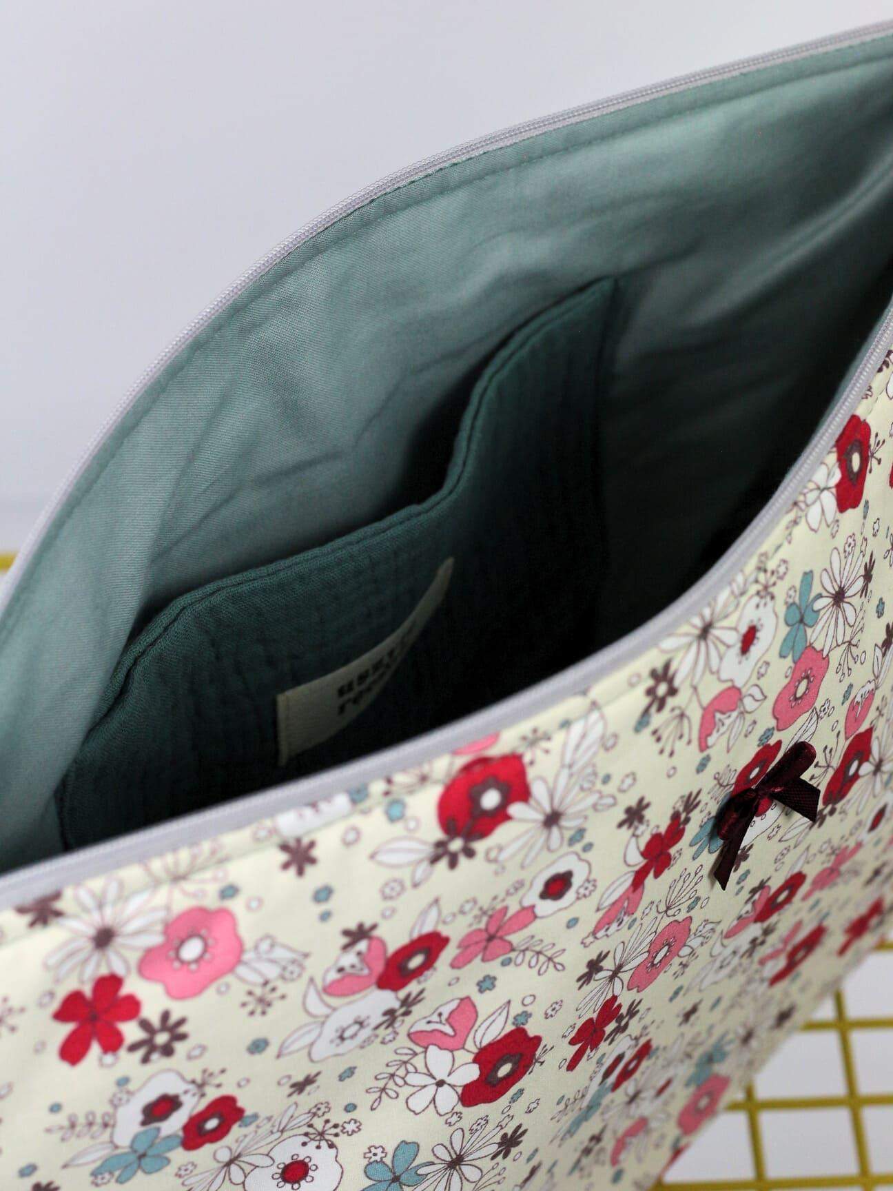Kosmetyczka w całości wykonana z bawełnianych tkanin. Zapiana na zamek, w środku posiada dodatkową kieszonkę.